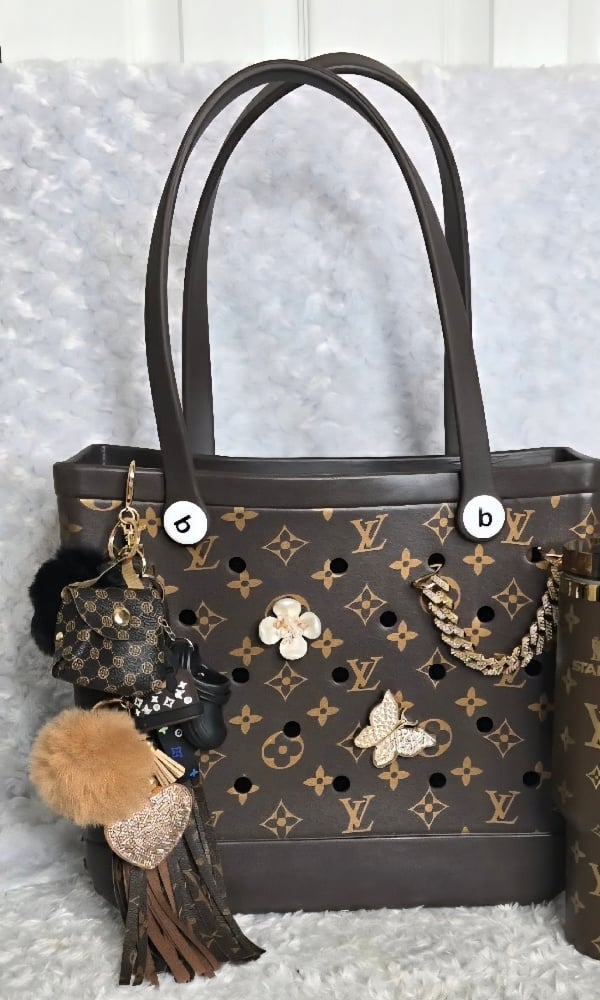 Bag comes with charms and keychain accessories. BAG WILL INCLUDE PINK CHARMS AND ACCESSORIES TO MATCH YOUR PINK SLIDES AND BRACELET STACK.