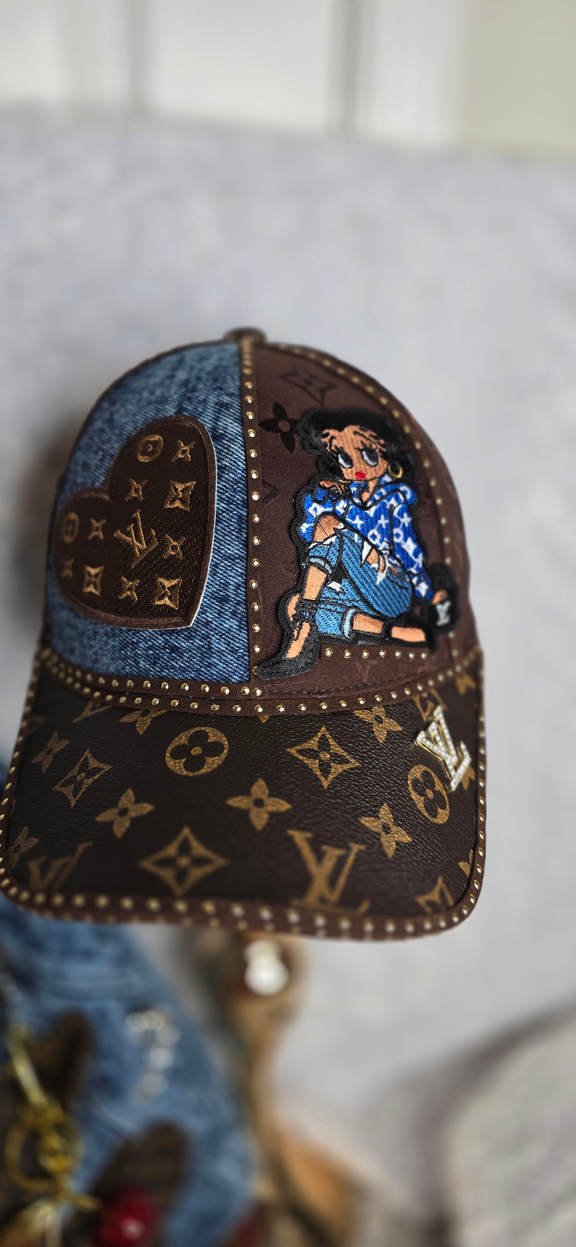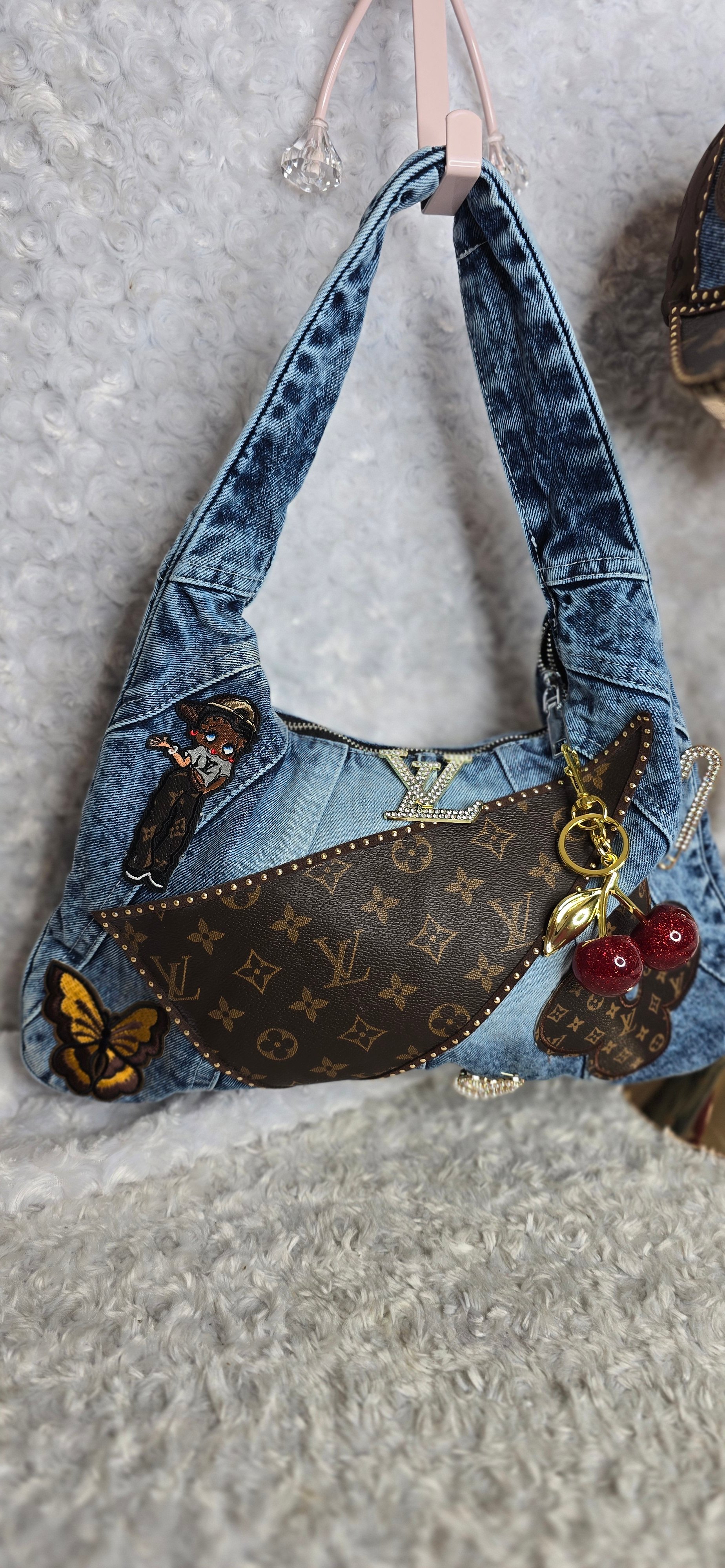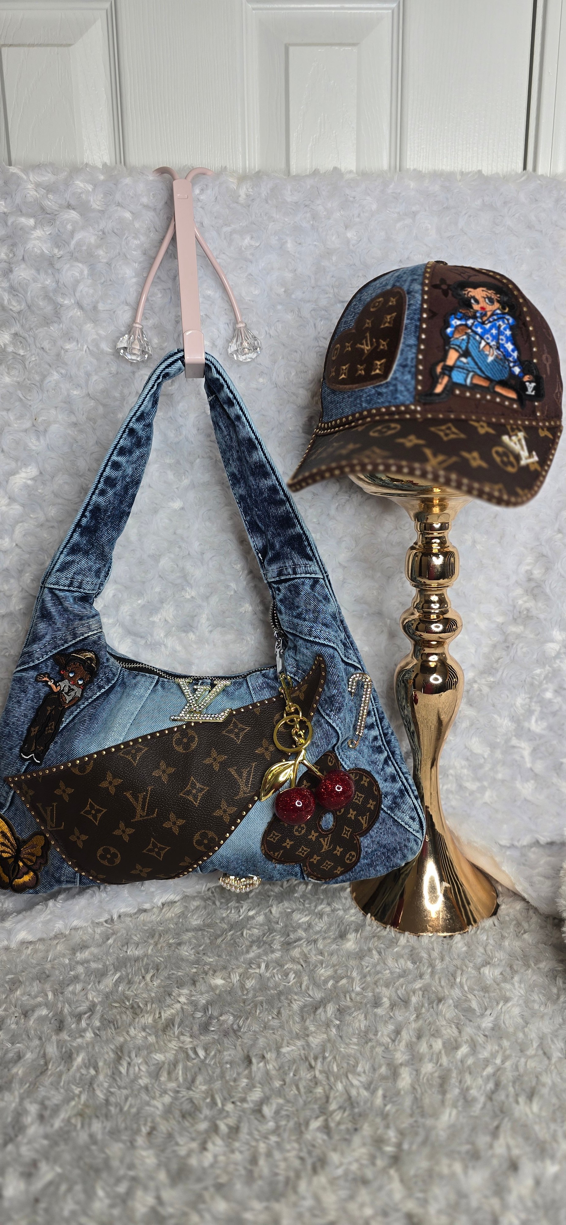 Denim shoulder bag & hat. Designed on both sides