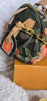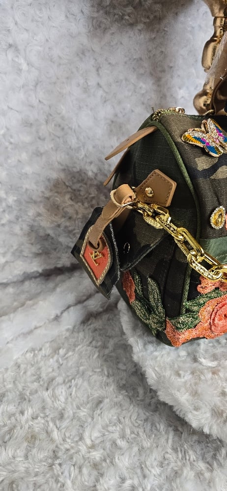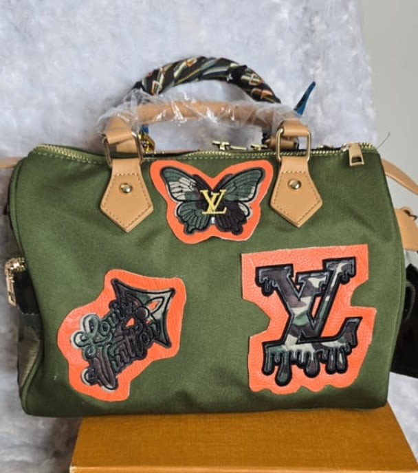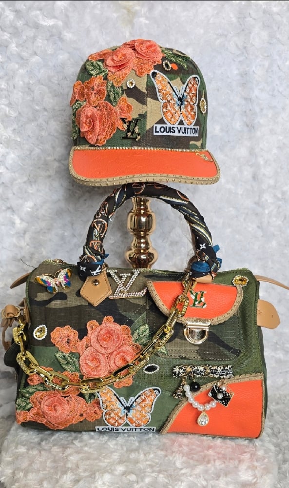 Orange & Camo Gorg girl speedy with matching hat. Patches on both sides. Includes charm keychain and scarf. Patches may differ no heart patches so will replace with a butterfly patch on hat and bag