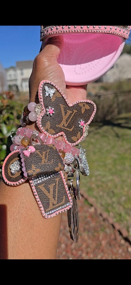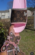 Pink & Brown Luv Croc Slides. Will include classic brown material on pink slides. Silver bling charms, Brown and Pink beads