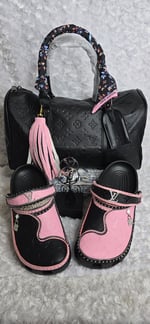 Size 9 Pink & Black Crocs, with Speedy with custom tassle
