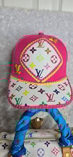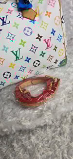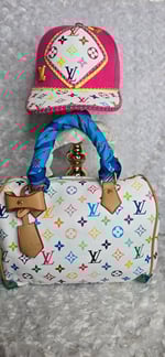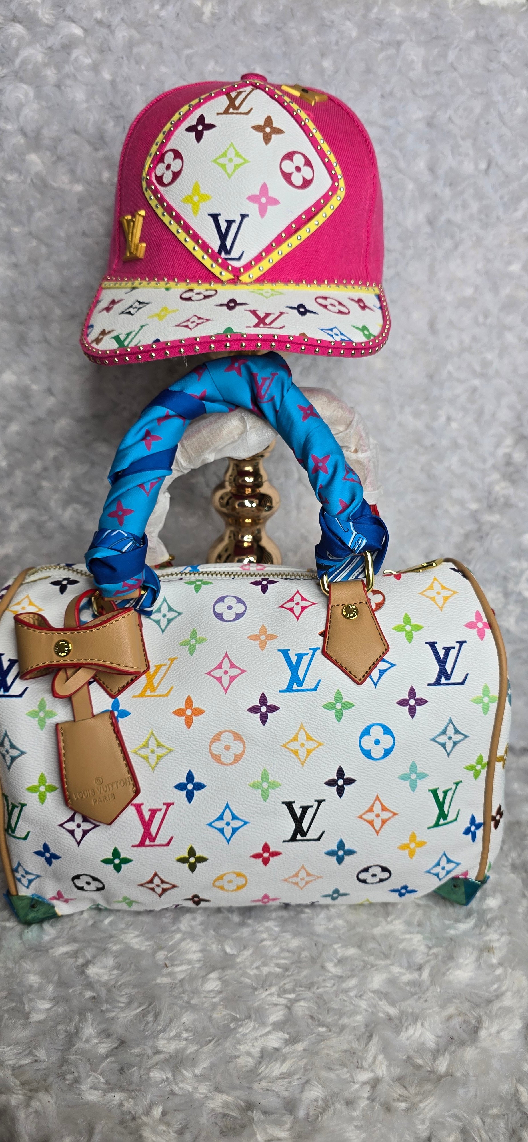 White Colorful Speedy with Pink Hat. Comes with scarf. Has Crossbody strap